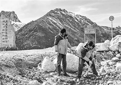 2024年11月1日,工人在国道317雀儿山段清理路边的沟渠。新华社记者王曦摄