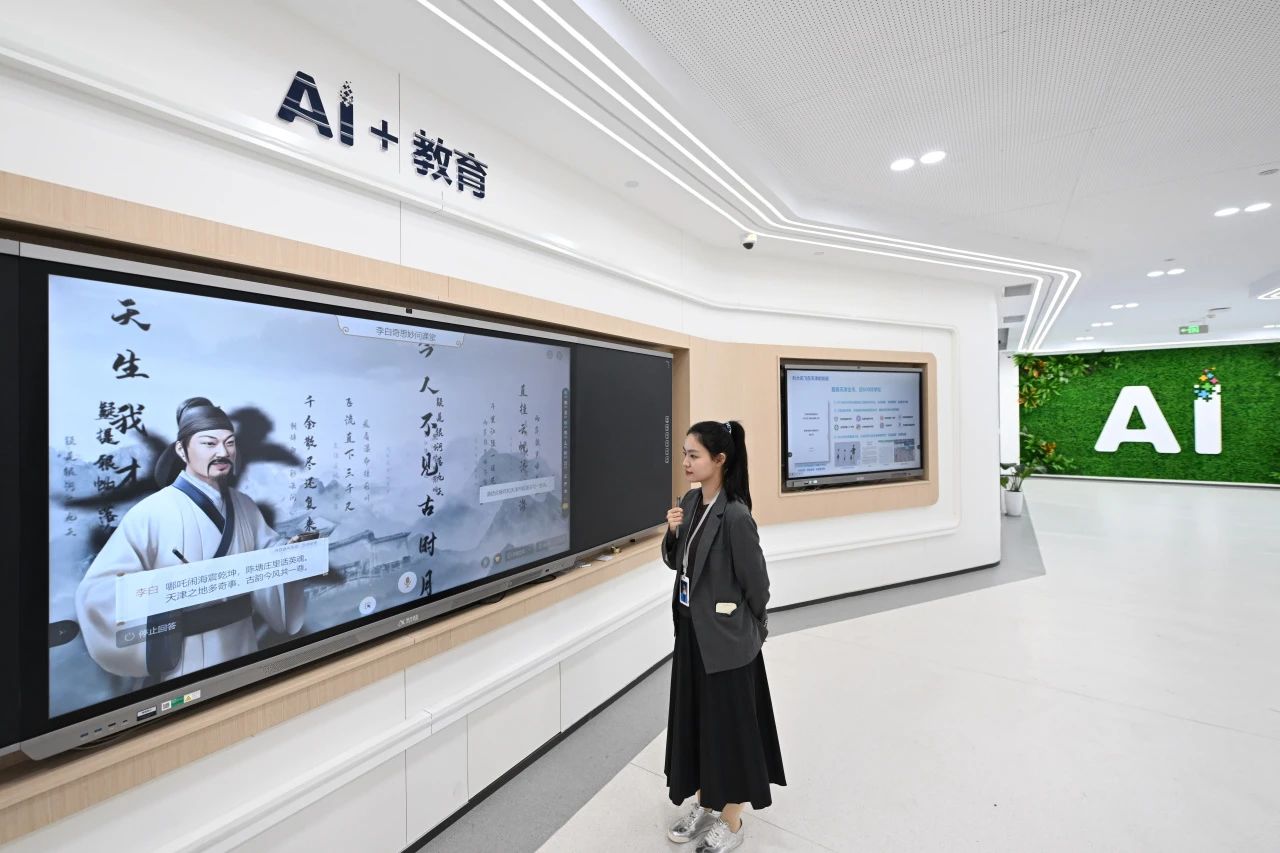 ▲在科大讯飞天津公司,工作人员展示用于教育领域的AI产品(4月18日摄)。新华社记者孙凡越摄